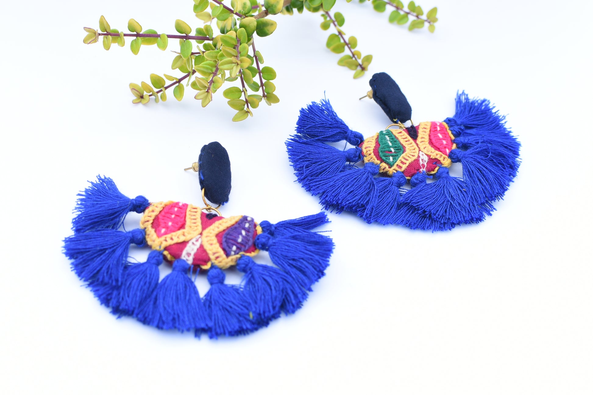 These eye-catching blue fabric earrings feature a festive pattern, perfect for making a statement no matter the occasion. Crafted with sleek lines and a timeless look, these earrings will bring a touch of glamour to any outfit.