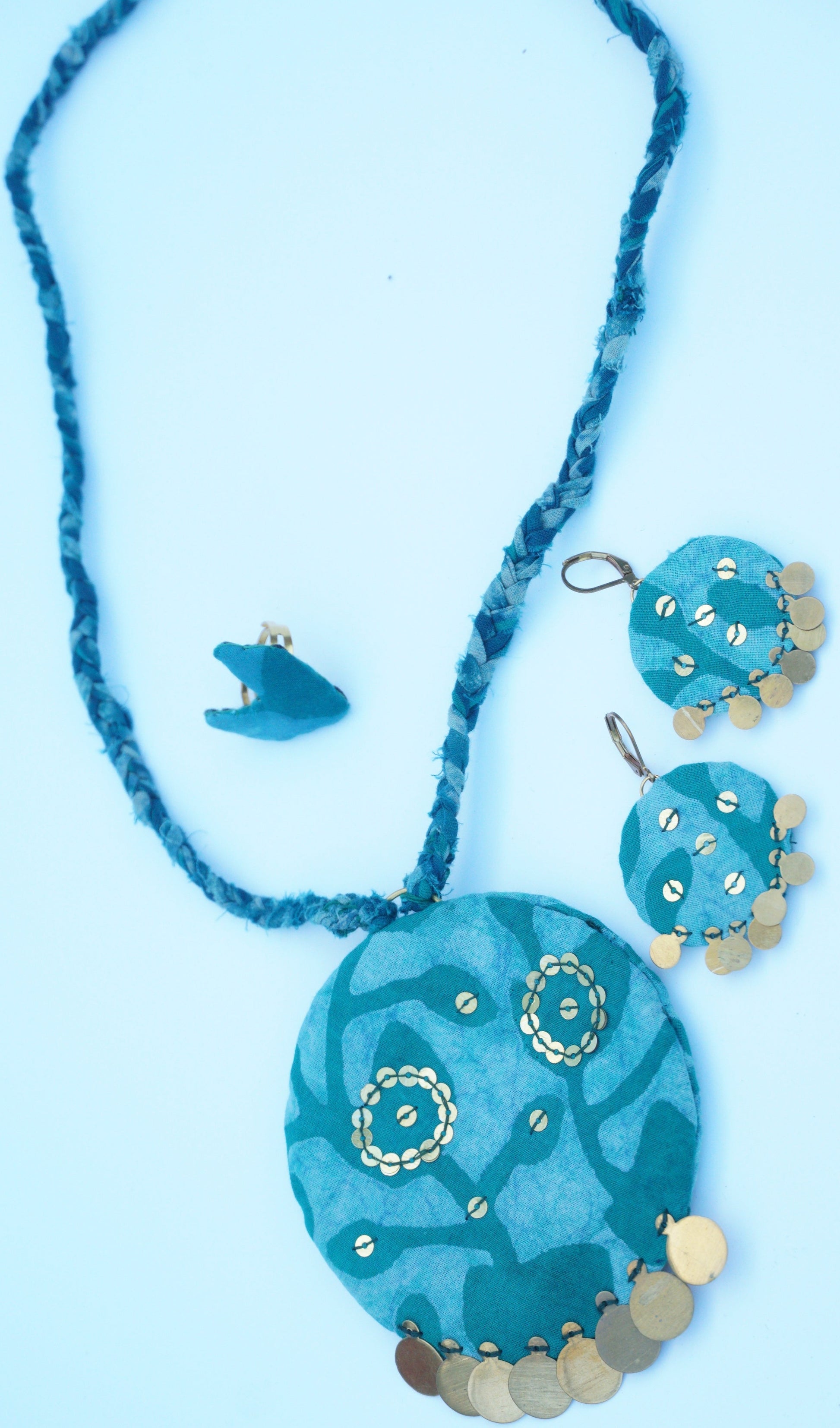 This green fabric necklace, earrings and ring set is perfect for adding a touch of color and life to your outfit. The necklace is designed with a unique pattern of cut fabric around the neck that brings the eye to its bright and vibrant green color, while the earrings and ring both feature a rustic, bohemian feel. Crafted from high quality fabrics, this set is sure to make a statement.