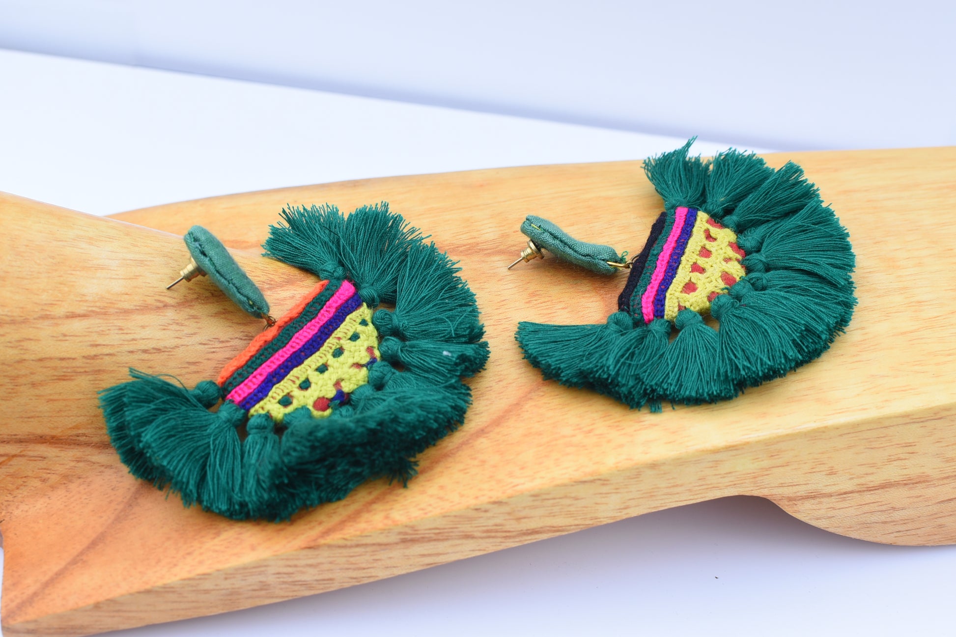 Hand crafted with luxurious fabric are unique earrings feature green tassels. The delicate details make them a perfect addition to your jewelry collection - perfect for any occasion.