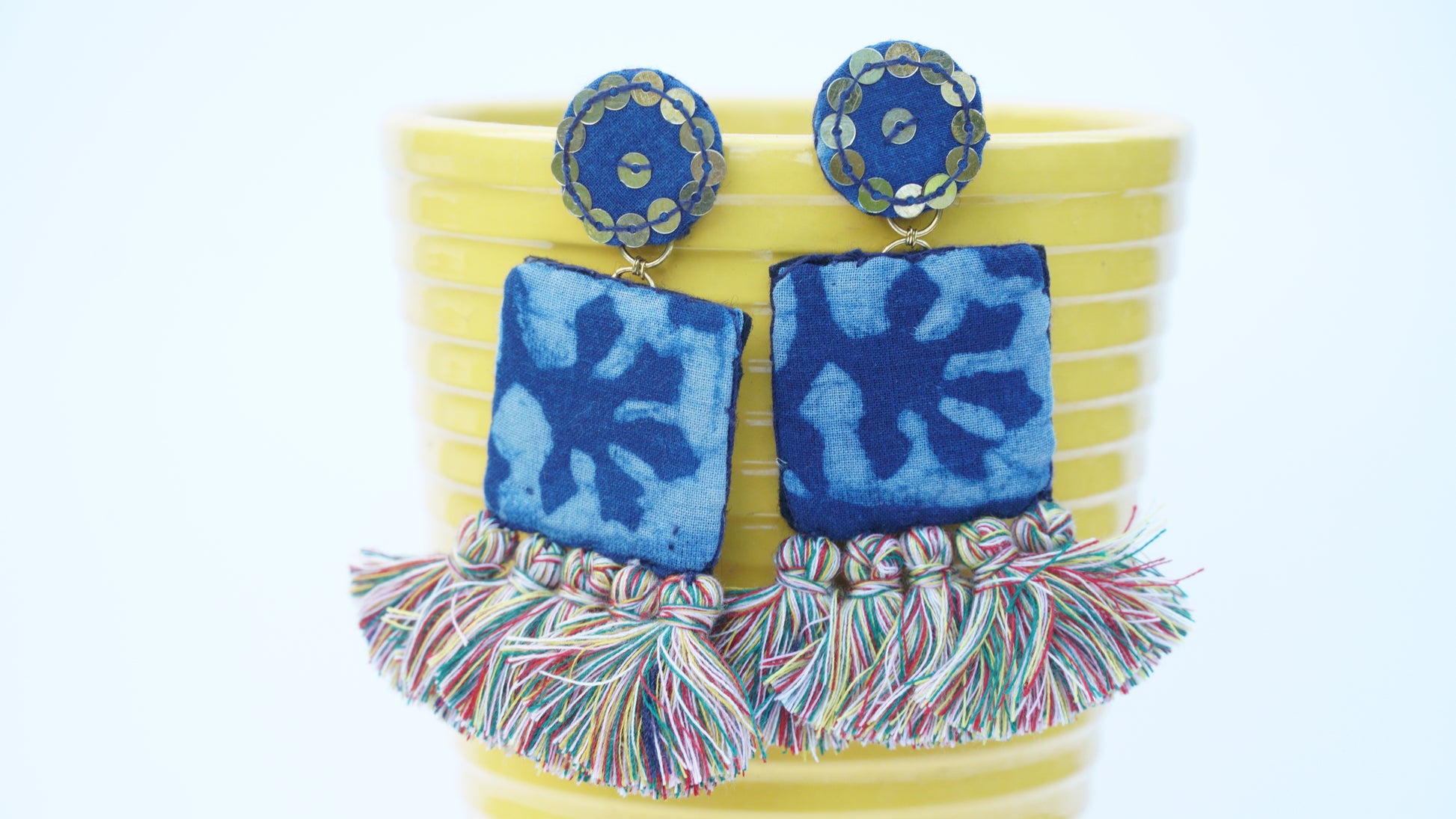 These unique earrings feature a square shape made of fabric with multi-colour tassels. The lightweight fabric and small size allows for all-day comfort and style. The vibrant multicolour tassels add an eye-catching look to any outfit. The perfect way to add a touch of fun to your wardrobe, these lightweight earrings offer a bold pop of colour without compromising on comfort.
